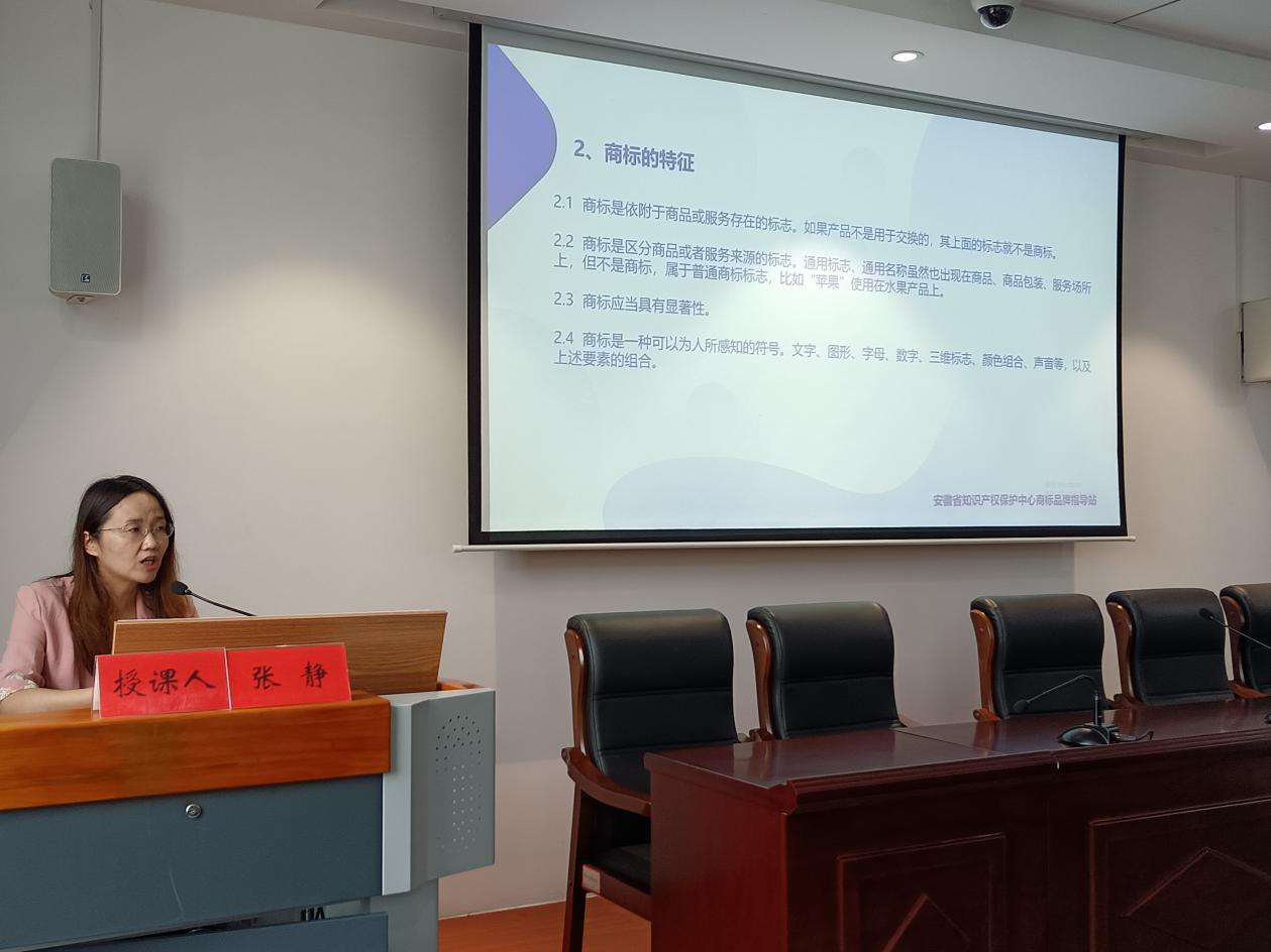 张静副总经理2004年毕业于安徽大学法学院,从事商标工作近二十年,对国内外商标注册、知识产权维权、地理标志商标与地理标志保护产品申报、中国驰名商标申报、区域公用品牌保护等具有丰富经验,成功处理过省内很多具有影响力的知识产权案件。培训会上,张静从知识产权保护的几个维度,结合实际案例从商标基础知识、商标注册与保护、地理标志保护、区域公用品牌保护和专利授权与保护五部分做了专题讲解。