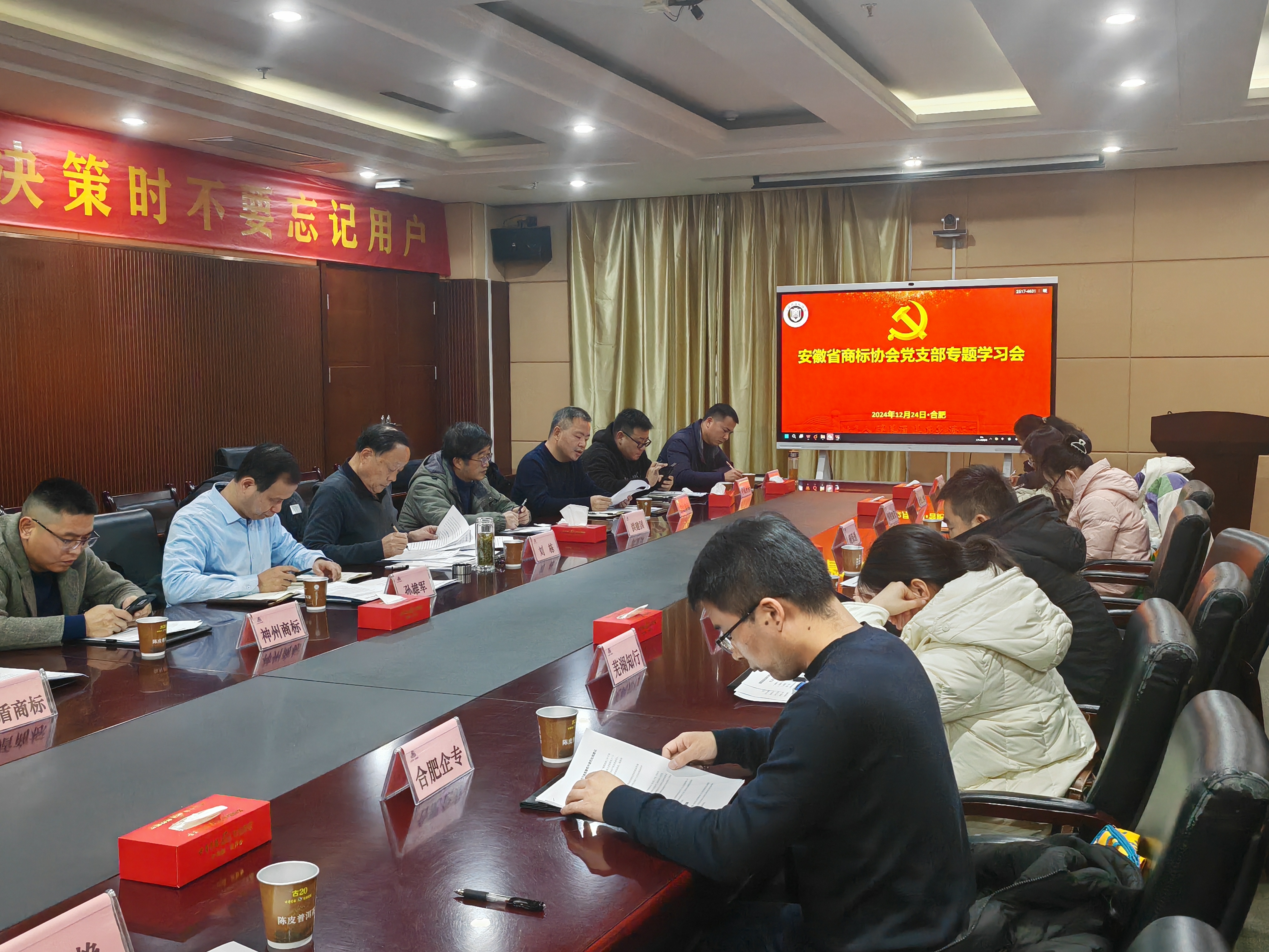 12月24日,省商标协会党支部召开专题学习会。省商标协会执行秘书长刘栋、首席顾问洪建国,国家知识产权局专利局合肥代办处负责人孙雄军出席会议。省商标协会党支部书记朱洪涛主持会议。