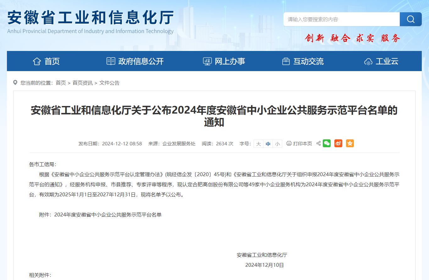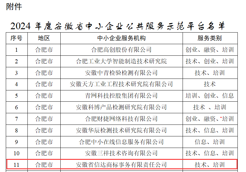 近日,安徽省工业和信息化厅公布了《2024年度安徽省中小企业公共服务示范平台名单》,安徽省信达商标事务有限责任公司作为安徽省唯一全国5A...