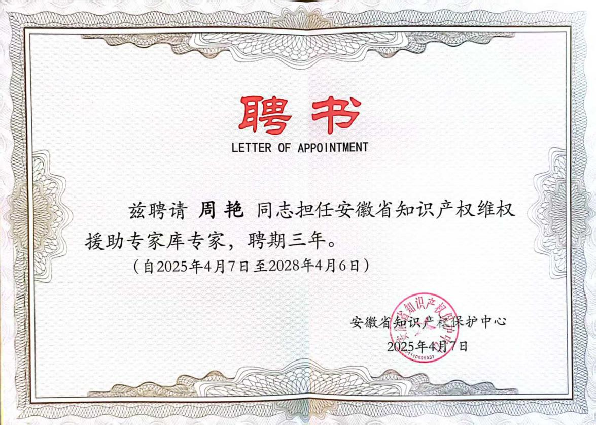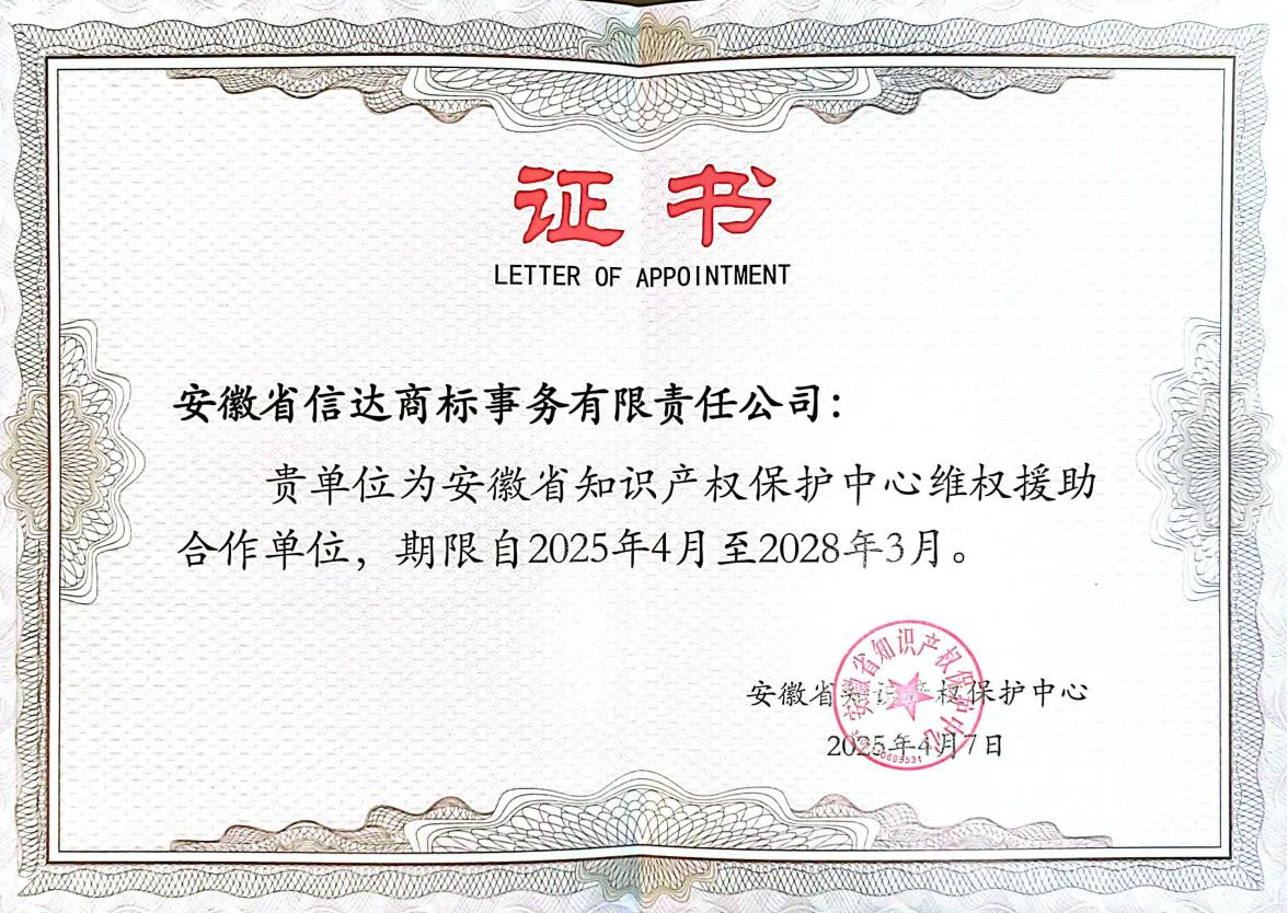 为贯彻落实《安徽省知识产权强省建设纲要(2021-2035年)》《安徽省“十四五”知识产权发展规划》文件要求,强化知识产权全链条保护,充分发挥专业人才对安徽省知识产权保护工作的促进作用,有效维护社会公众和创新主体的合法权益,提高知识产权维权援助公益服务水平,省知识产权保护中心向社会公开征集知识产权维权援助合作单位,同时开展了第二批知识产权维权援助专家征集工作。安徽省信达商标事务有限责任公司受聘担任维权援助合作单位,公司副总经理周艳、张静入选省知识产权维权援助专家库专家。