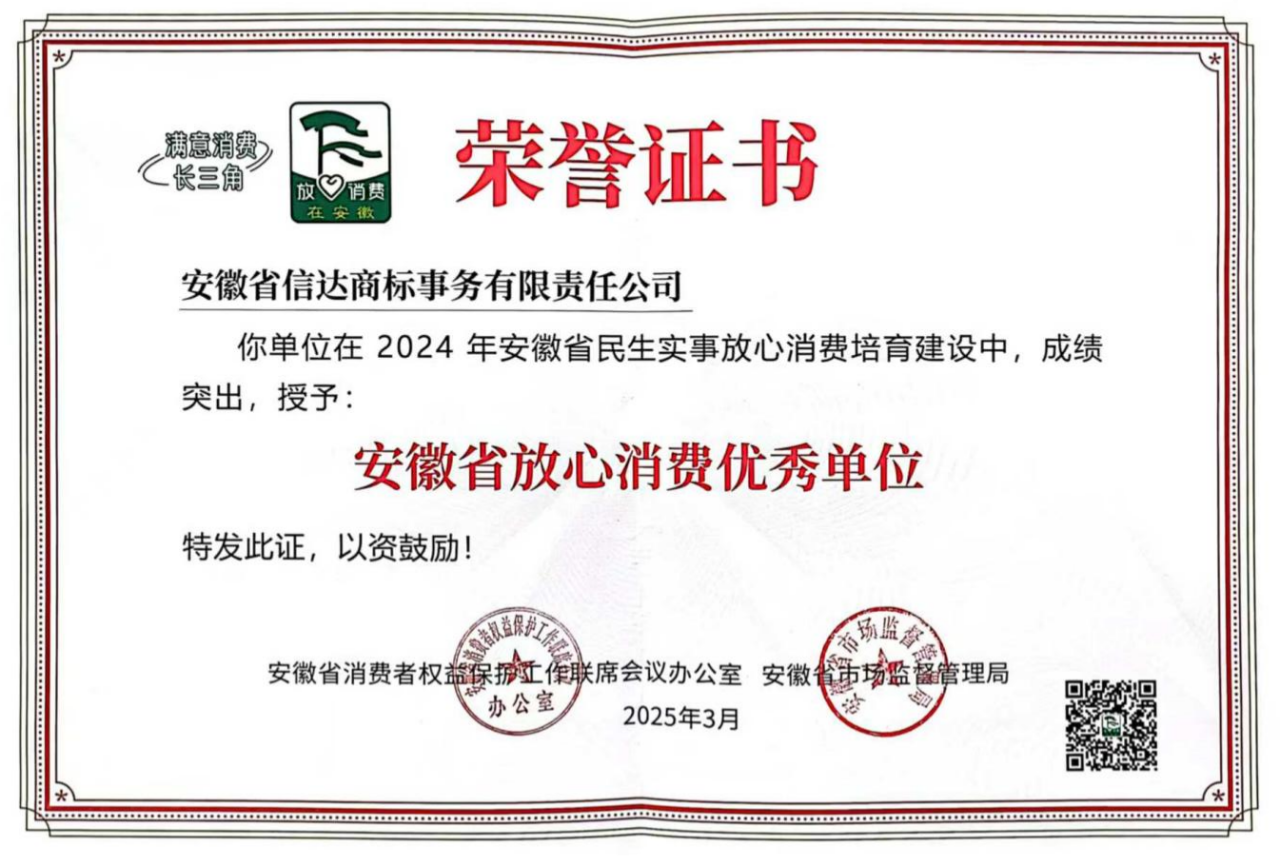 2025年5月28日,由安徽省质量品牌促进会、合肥市发展和改革委员会主办的,中国品牌日安徽特色活动暨“皖美品牌”宣传周系列活动之“提振消费优化消费环境主题分享会”在合肥举办。安徽省信达商标事务有限责任公司副总经理张静作为获奖单位代表,上台领取了“2024年度安徽省放心消费优秀单位”证书。安徽省信达商标事务有限责任公司也是2024年度唯一一家获此殊荣的安徽省知识产权服务机构。