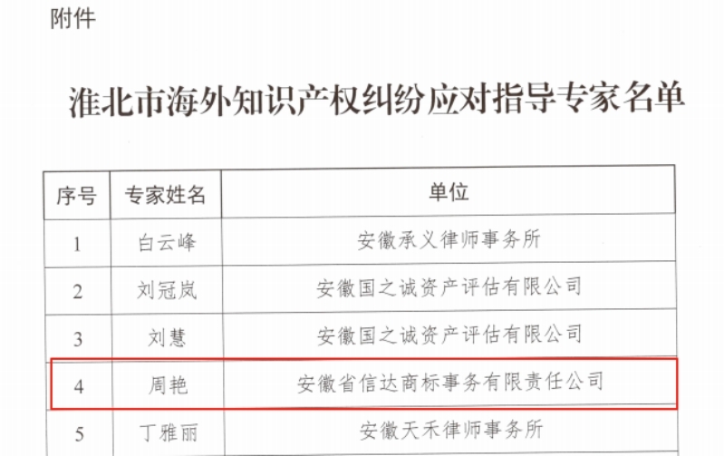 日前,淮北市知识产权发展中心公布了淮北市海外知识产权纠纷应对指导专家库名单,安徽省信达商标事务有限责任公司副总经理周艳成功入选。