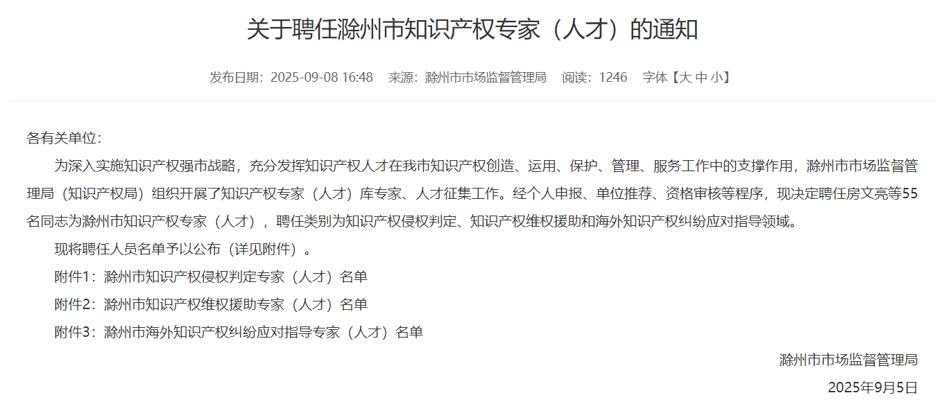 据悉,此次受聘担任滁州市知识产权侵权判定专家共计15名。受聘专家将参与滁州市的知识产权侵权判定,疑难知识产权案件或涉外重大知识产权纠纷与争端研究讨论,提出具有有效解决方案的专家建议。