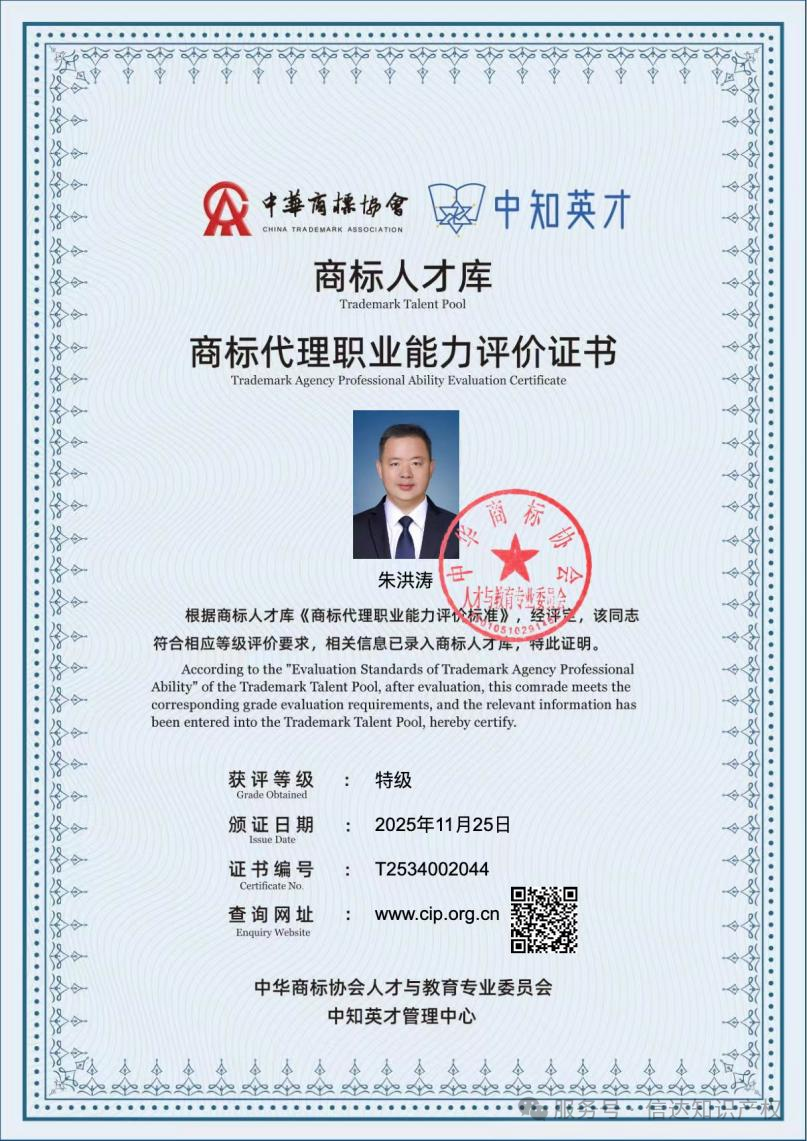 2025年11月23日,中华商标协会公布了2025商标人才库入库申报(第二批)的评价结果。安徽省信达商标事务有限责任公司董事长朱洪涛成功获评特...