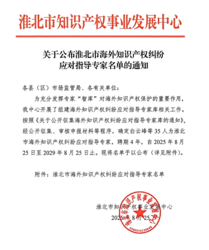 日前,淮北市知识产权发展中心公布了淮北市海外知识产权纠纷应对指导专家库名单,安徽省信达商标事务有限责任公司副总经理周艳成功入选。为